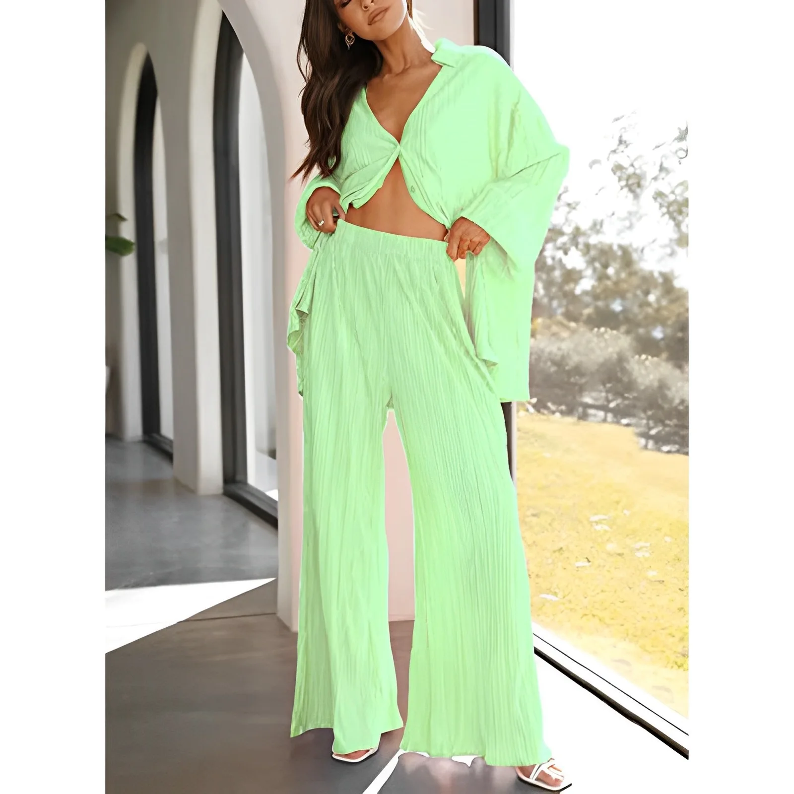 Elegant Pleated Beige 2 Piece Pant Sets Outfits Causal Loose Home Suit Autumn Long Sleeve Blouse Pants Set Women Pajamas Set